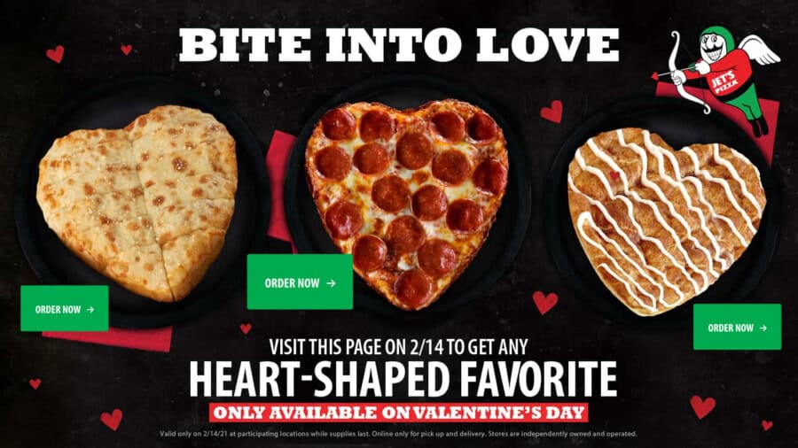 LOVE AT FIRST BITE Who needs flowers and chocolate when you could have heart-shaped pizza, Jet’s® Bread and Cinnamon Stix. That’s a much better way of saying “I love you.” Valid 2/14 Only
